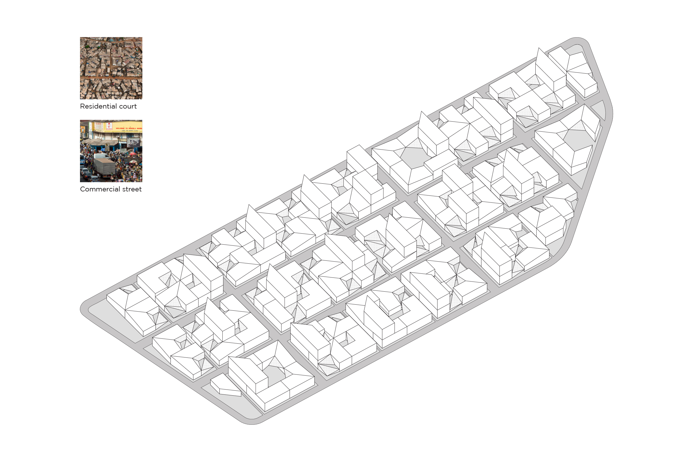 Accra, GhanaThis mixed-use development at Accra is comprised of 23 blocks of residential and commercial program. These contiguous blocks are developed to produce a coherent, urban fabric that operates like an expansive mat building. The commercial streets are given the same dimensional increment as L shaped building units and voided courts lending the district a geometric coherence. The four-unit distribution per block produces streetscapes and courtyards that vary in scale, cadence, and function. The public life of the street circulates into and out of the courtyards yielding vitality to the spatially conceived, urban fabric.