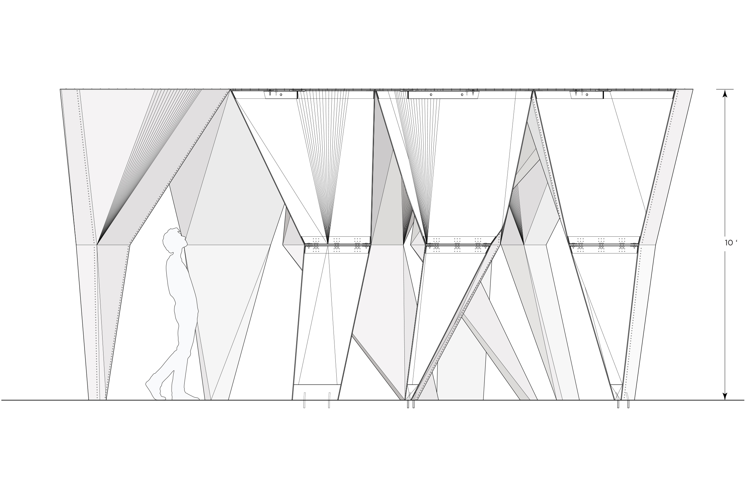 is a group of columns poised on blade-like fulcrums defining dynamic spaces below. To achieve a balanced state, the mass and silhouette of each column are eccentrically distributed to stabilize its adjacent columns. While unstable individually, the columns enter a state of poise when grouped.