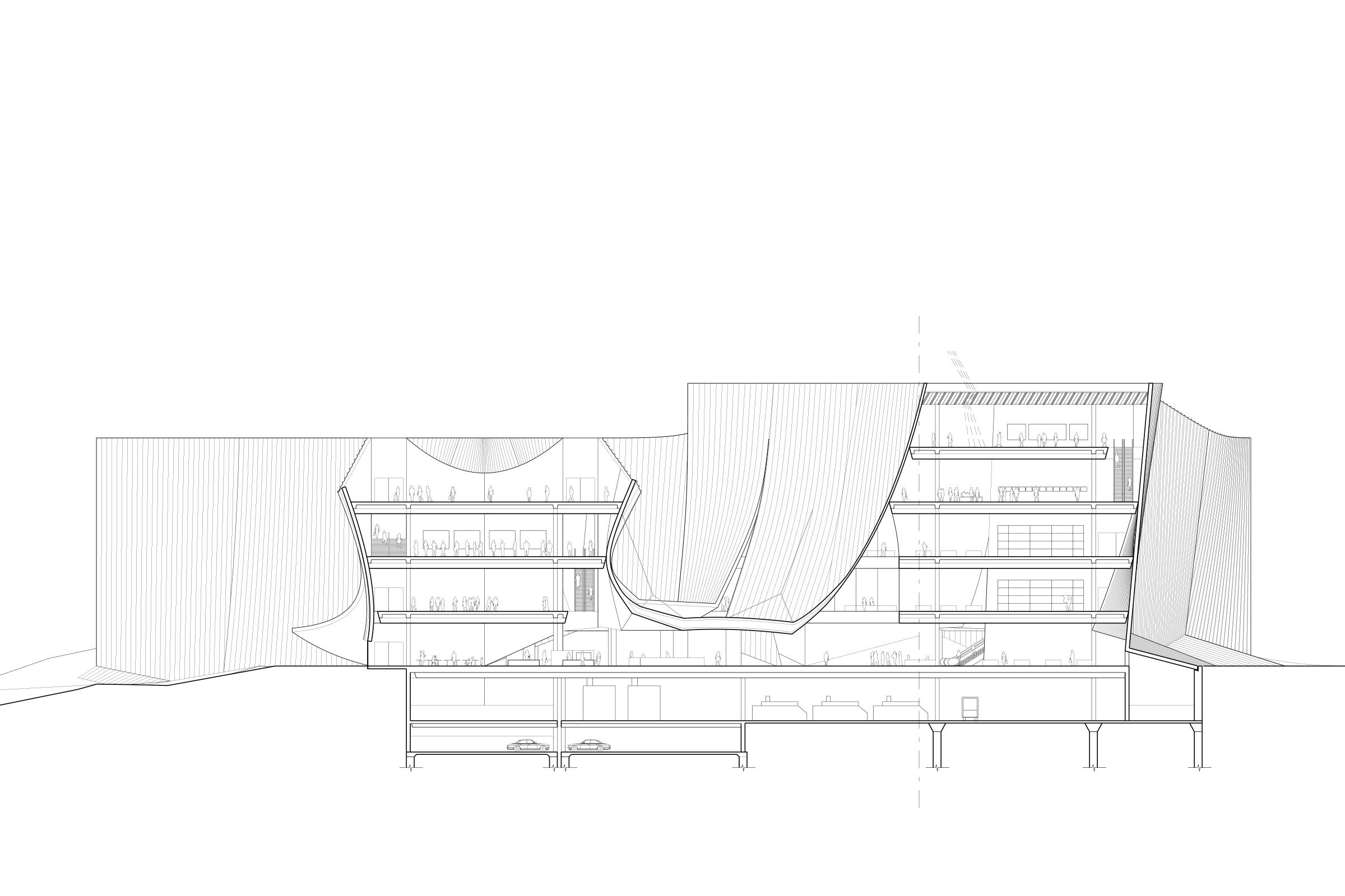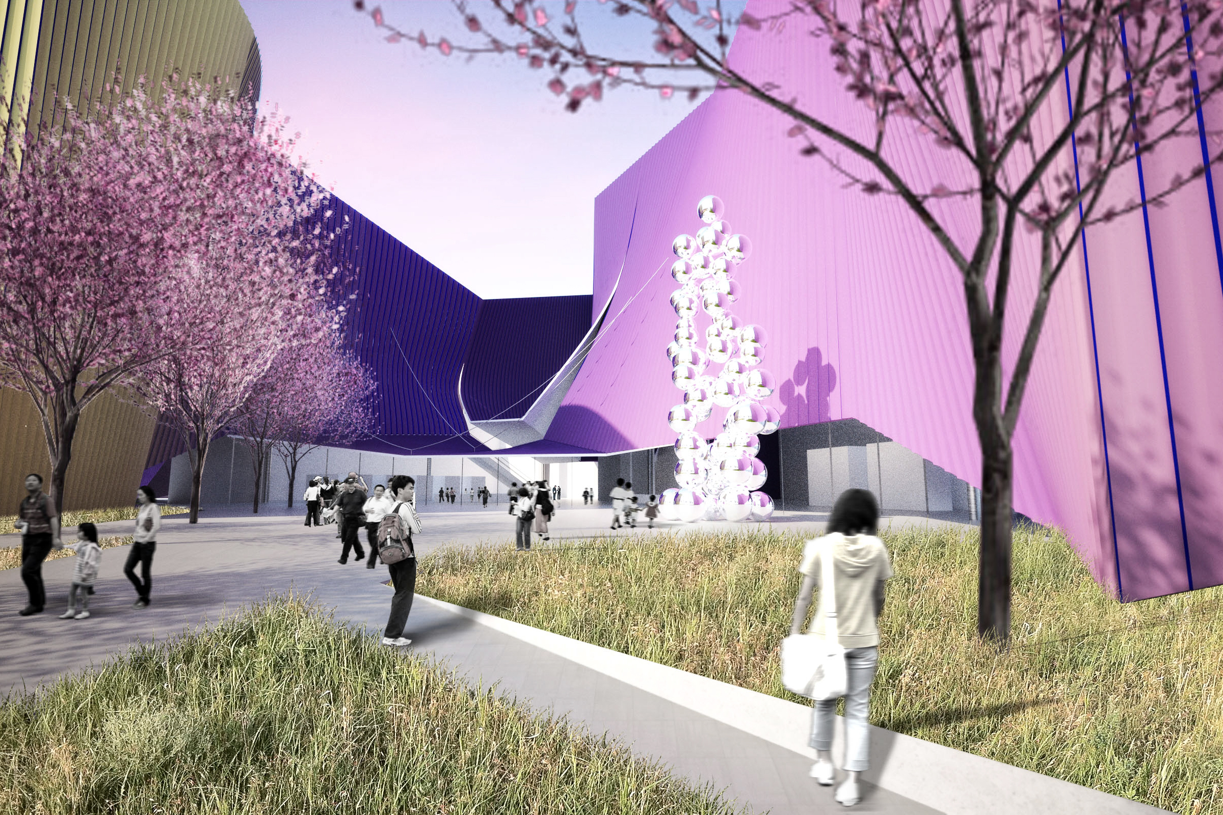 Our proposal wears a loose cloak of color that sweeps lightly across the landscape, leaving elegant contours in its wake. Resembling large sails, the building’s surfaces appear to flutter as lenticular color effects enliven its surfaces. The building’s figure remains elusive like a body concealed behind a loose dress. This elusiveness animates the project’s changing silhouette and draws relationships between the project and the surrounding urban fabric. Despite its large scale, the museum experience is punctuated by unique and dramatic spaces that move from vast and horizontal to tall and sculptural. Our galleries are both separated and connected by interstitial voids that cascade through the interior and organize visitor circulation. While our cloak protects artwork from the heat and potential damage of direct daylight, it also opens public amenity and lobby spaces to the exterior and defines outdoor spaces including a central art plaza where visitors and staff alike gather for events and exhibitions.