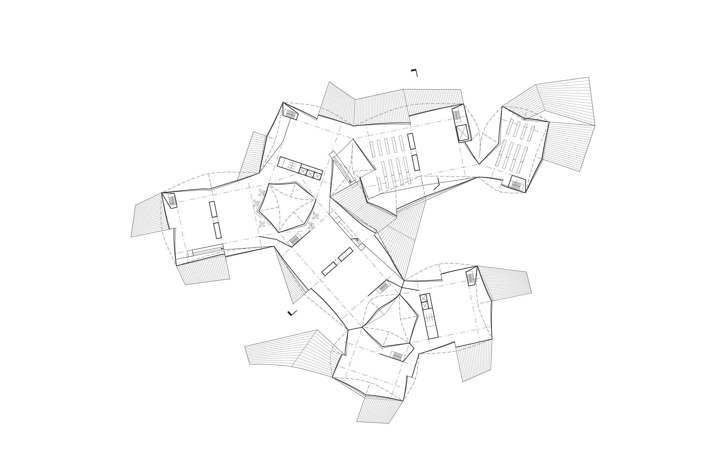 Our cloak draws the organizational and the cosmetic together through the use of sheet logics. The project’s surfaces, both its envelopes and suspended roof canopies, are clad in colorful, glazed ceramic extrusions, capitalizing on the robust ceramics industry of the Yingge District. Each extrusion is v-shaped with unequal faces. The smaller face is glazed a deep blue color. The larger face changes from vibrant yellow to rich purple depending on its location on the building. Here, color is selected in relation to solar exposure, spatial adjacency and massing. The color deepens as spaces become more enclosed and immersive. Across the project, color is not assigned to individual faces; rather it is allowed to roll over corners and creases. This heightens the experience of the façade as vast, flowing sheets. High contrast colors are selected for the outer faces of the building to captivate viewers from a distance while subtle color variations are selected for the pedestrian spaces of the central art plaza.