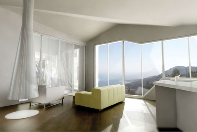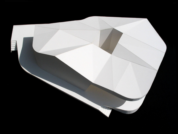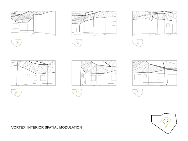 The project’s ambition lies in its dramatic spatial modulation and the saturation of its interior with the visual and geometric material of the surrounding site. Rather than understanding the views as a way to release the interior to the exterior, the surrounding geometric and topographic features are drawn into the interior to condition its atmosphere. Artificial and natural geometries are characterized as of the same fluid medium, and the house is a vortex into which this material is drawn. This ambition shapes each part of the house’s organization: a five-sided sculpted massing, a folded roof plane, an exterior wrapper, and a covered patio.
